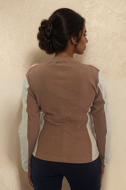 Mock Neck Color Blocked Rib Top (Brown) - Clara